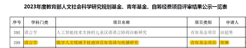 2023年9月15日,教育部社科司发布了《关于2023年度教育部人文社会科学研究一般项目立项的通知》,开云体育 黄立波教授指导的2023级博士生贺琳课题《数字人文视域下杜甫诗百年英译与传播研究》拟获批青年基金项目立项。