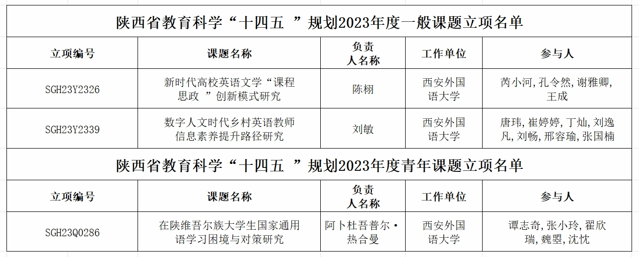 近日,陕西省教育科学规划领导小组公布了陕西省教育科学“十四五”规划2023年度课题立项结果。经个人申报、专家严格评审、课题拟立项公示、省规划办最终审核等环节,开云体育 共有三项课题获批立项,其中开云体育 陈栩副教授课题《新时代高校英语文学“课程思政”创新模式研究》、刘敏副教授课题《数字人文时代乡村英语教师信息素养提升路径研究》分别获批一般课题立项,开云体育 师资博士后阿卜杜吾普尔·热合曼博士课题《在陕维吾尔族大学生国家通用语学习困境与对策研究》获批青年课题立项,名单如下。