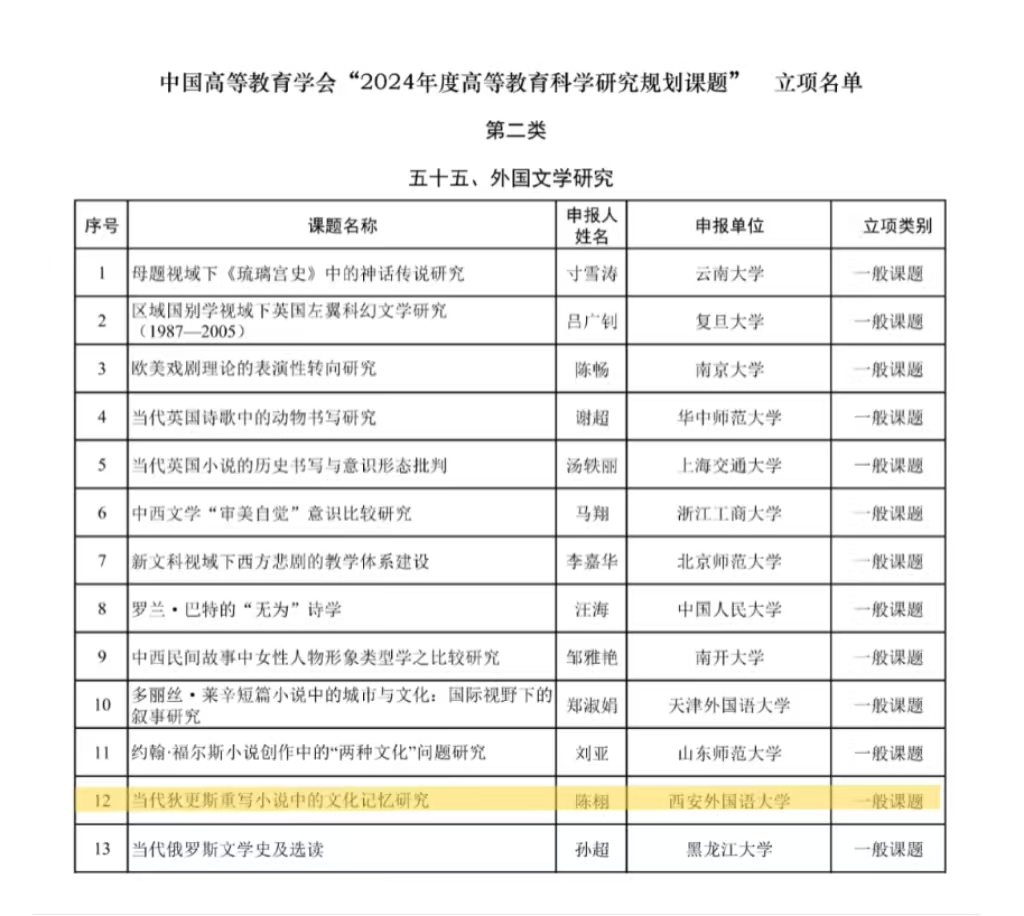 中国高等教育学会是我国高等教育领域成立时间最长、规模最大、凝聚力最强、影响力最广的全国性学术社团组织,现已发展成为党和政府联系广大高校和高教工作者的桥梁纽带,高等教育理论研究和成果推广的重要阵地,专家学者和关心高等教育事业各界人士交流合作的重要平台,服务高等教育对外开放的重要力量。中国高等教育学会于2024年5月启动了“2024年度高等教育科学研究规划课题”申报工作,经资格审查、匿名评审,最终评选出拟立项课题1156项,其中“外国文学研究”课题共立项13项。