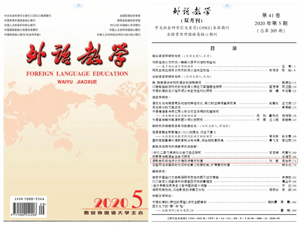 刘敏博士和美国宏谷州立大学吴始年教授在《外语教学》上合作发表题为“英语教学形成性评价云端测评模式构建”的学术论文。