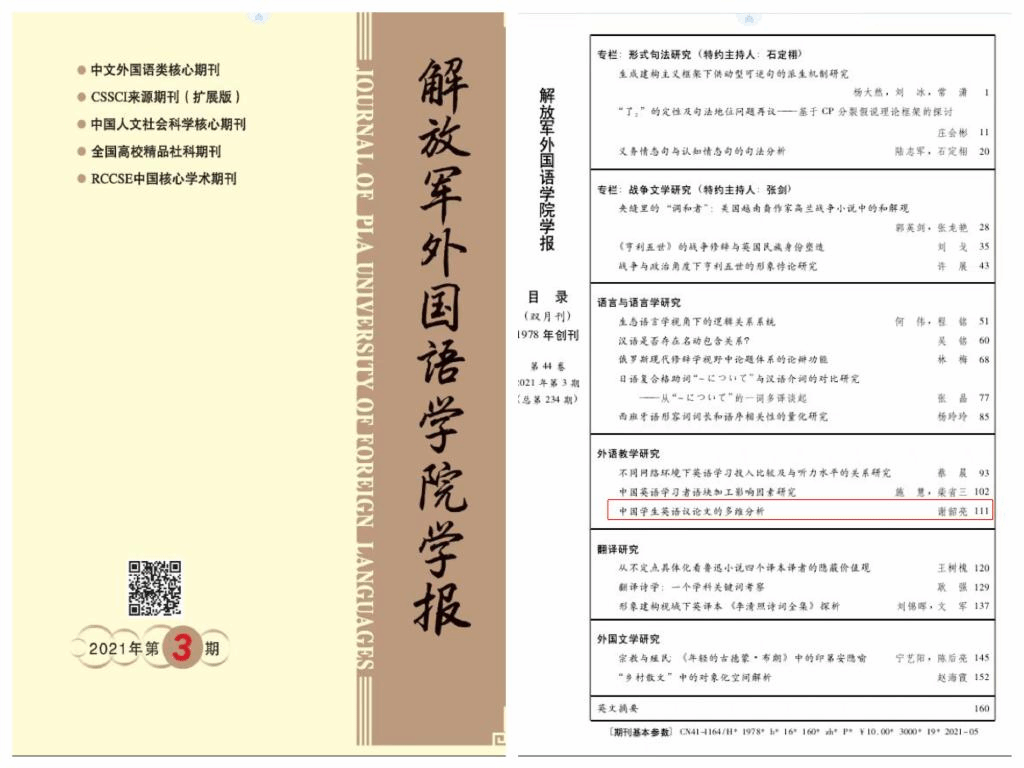开云体育 谢韶亮博士在《解放军外国语学院学报》2021年第3期上发表题为“中国学生英语议论文的多维分析”的学术论文。