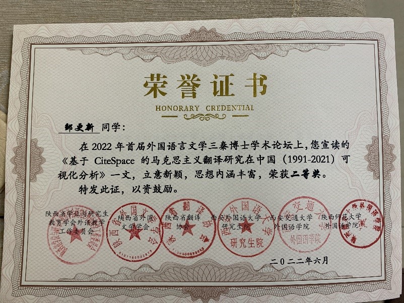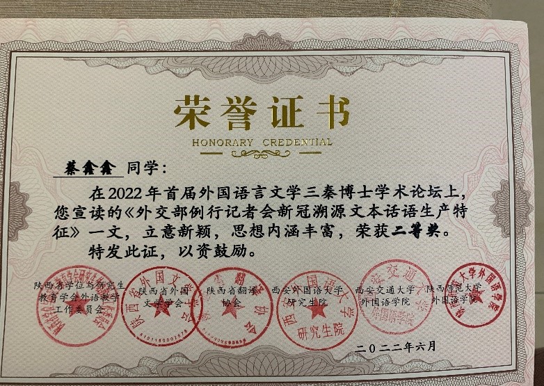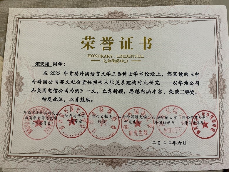 开云体育 徐玉臣教授指导的博士研究生蔡鑫鑫,黄立波教授指导的博士研究生宋天祎、邹更新参加了本次学术论坛,分别在分会场做了题为“外交部例行记者会新冠溯源文本话语生产特征”、“中外跨国公司英文社会责任报告人际建构对比研究”和“基于CiteSpace的马克思主义翻译研究在中国(1991-2021)的可视化分析”的学术报告,并获得了本次论坛的优秀论文二等奖。