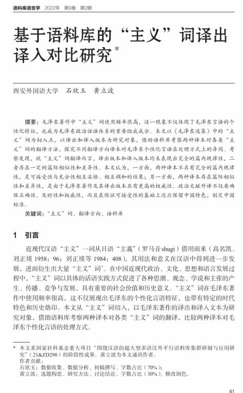 石欣玉博士、黄立波教授在《语料库语言学》上合作发表题为“基于语料库的‘主义’词译出译入对比研究”的学术论文。