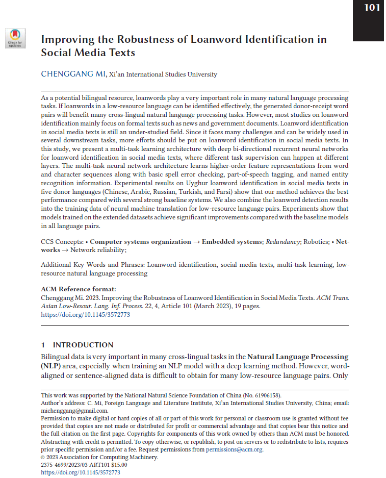 米成刚博士在《ACM Transactions on Asian and Low-Resource Language Information Processing》2023年第12卷第4期上发表题为“Improving the Robustness of Loanword Identification in Social Media Texts”的学术论文。