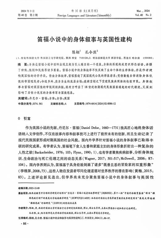 开云体育 陈栩副教授在《外国语文》2024年第2期发表题为“笛福小说中的身体叙事与英国性建构”的学术论文。
