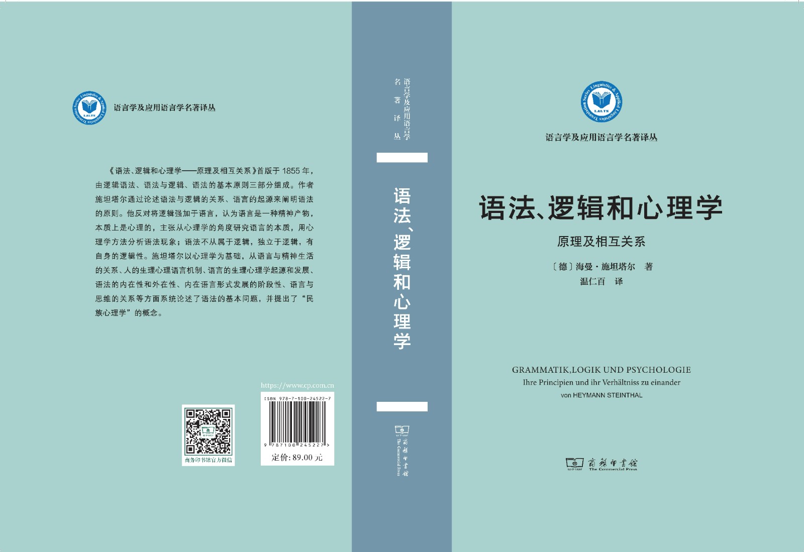 译者温仁百教授指出,德国人对语言的思考和研究在19世纪达到很高水平,对语言的起源,语言的本质,语言与人(思维),语言发展的生理、心理关系,语言研究的对象、任务和方法等科学体系的思考均取得了突破性的成就,经典著作层出不穷,对语言学乃至整个人文社科的发展都产生了巨大影响。这些著作不仅涉及人文社会科学,也涉及自然科学,是百科全书式的,其思想的丰富性、深刻性和体系性达到很高水平,对这些经典著作进行译介有助于追溯科学公理的起源、厘清科学的脉络,因而意义重大。此前温仁百教授已在商务出版社出版了《语言学辞典》(2003)、《卡尔·比勒语言哲学文集》(2017)、《普通语言学》(2020)以及《语言理论——语言的描述功能》(2022)等多部德国语言学经典著作的汉译。此次出版的《语法、逻辑和心理学:原理及相互关系》是商务印书馆“语言学及应用语言学名著译丛”系列丛书,该译丛遴选的专著涵盖了理论与方法、语音与音系、词法与句法、语义与语用、教育与学习、认知与大脑、话语与社会等学科门类。