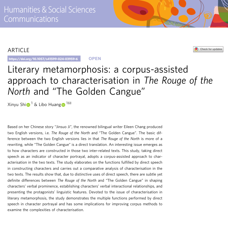 石欣玉博士、黄立波教授在Humanities & Social Sciences Communications期刊2024年第11卷发表题为Literary metamorphosis: a corpus-assisted approach to characterisation in The Rouge of the North and “The Golden Cangue” 的学术论文。