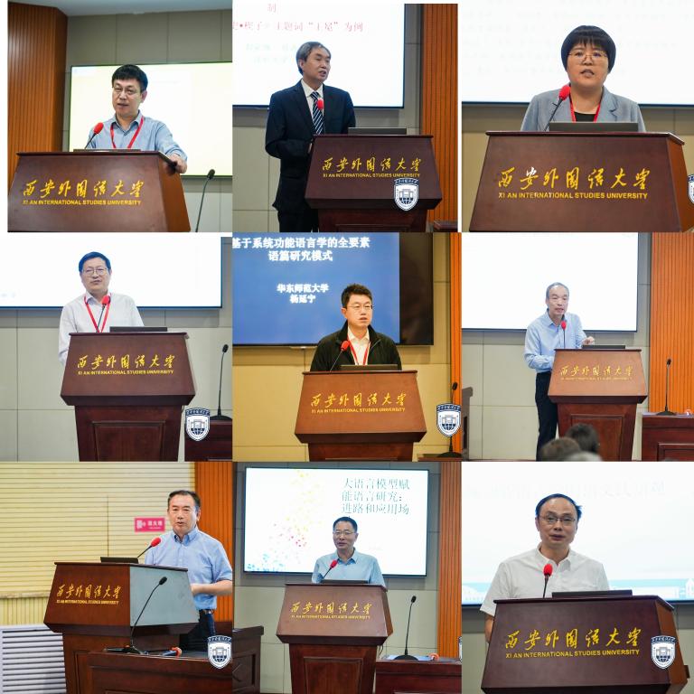 在主旨发言环节,西安外国语大学副校长姜亚军教授在简要回顾近年学术语篇研究的基础上,深入探讨了我国英语专业学位论文的规则与标准、语篇特征、跨文化性及学术性,并对英语学位论文教学和指导提出建议。湖南大学刘正光教授基于物理学中时间和空间的概念,详尽论述了认知语法体系中时间性与情态的相互关系。清华大学封宗信教授探讨了韩礼德和乔姆斯基共同的符号学理论视野和对经典语用学理论的参照,深入剖析了功能语言学与生成语言学对当代语用学理论的影响。南京大学陈新仁教授从具体语句表达方式切入,从功能语言学视角和语用学理论视角展开了访谈语境下名人形象自塑话语的元语用研究。华东师范大学杨延宁教授对语篇研究路径进行了规划和整合,全面阐述了基于系统功能语言学的全要素语篇研究模式。曲阜师范大学秦洪武教授梳理了大语言模型“语义能力”的表征方式,细致探讨了语义能力赋能语言研究的进路及应用场景。北京外国语大学何伟教授从系统功能语言学视角对现代汉语独语句进行了深入研究,探讨了独语句作为非基本小句的语义和句法特点。深圳大学彭宣维教授与刘涵博士以《儒林外史·楔子》主题词“王冕”为例,深刻阐述了句法功能及其特征在语篇过程中的概率表现与生成机制。中山大学王勇教授从语法、认知、意义等核心概念出发,深入探究了系统功能语言学的认知观和意义观,认为其是辩证法和进化论的语言观的体现,对当下话语实践具有启示意义。