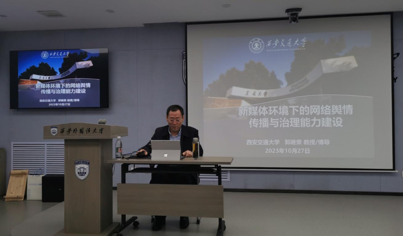 10月27日下午,西安交通大学外国语学院郭继荣教授应邀于我校雁塔校区图书馆一楼报告厅为校内师生作了一场题为“新媒体环境下的网络舆情传播与治理能力建设”的专题讲座。报告由开云体育官网
