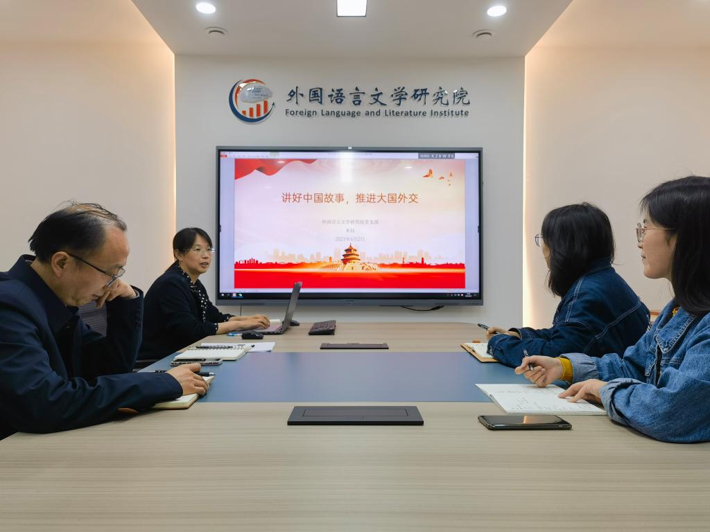 会议室开展专题党课,支部副书记米钰以“讲好中国故事,推进大国外交”为题进行了专题党课讲授。