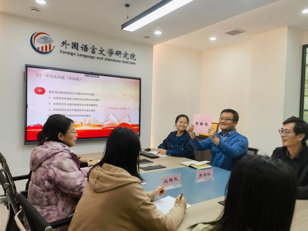 党员教师分为两队以抢答形式开展,队伍累计得分最高者获胜。